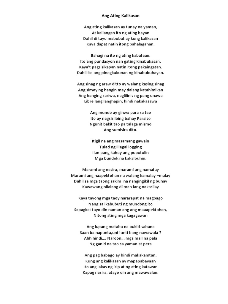 Ang kalikasan natin ay nawawalan na ng pasensya Kahit hindi naririnig hinahanap niya ang hustisya Napakaraming papel ang nagagawa sa isang araw Konti nalang ang mga kahoy na sa hangin sumasayaw Ngunit pagkatapos ng lahat tayoy maapektuhan din Ng problemang ating ginawa sa loob ng awitin Kaya bago maging huli ang lahat tayoy magbago na. Spoken poetry about sa pag-ibig sa kalikasan. Ang gubat sa bundok ay gubat ng yaman.