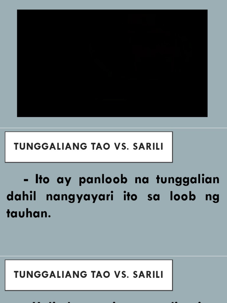 Tunggalian - May apat na uri. Tunggaliang tao vs sarili kahulugan. Itoy ginagamit para makapagbigay ng kapana-panabik na mga pangyayari.
