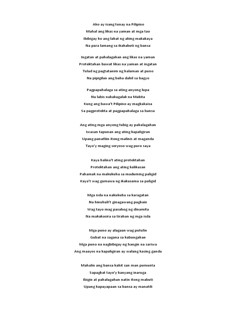 Bakit ba natin inaabuso Si inang kalikasan Pumuputol na puno Hindi man lang kayang palitan. Polusyong galing sa mga sasakyan Mula sa pabrikat paggawaan Dinudumihan ang tubig natin Pati na ang hanging hinihinga nakin Basura mong itinapon sa daan Ngayon sa bahay naging dahilan Kailan ka pa ba magiging responsable. Tayo ay may responsibilidad sino and iresponsable kailan pa ba tayo kikilos para maisalba ang ating paghihirap.