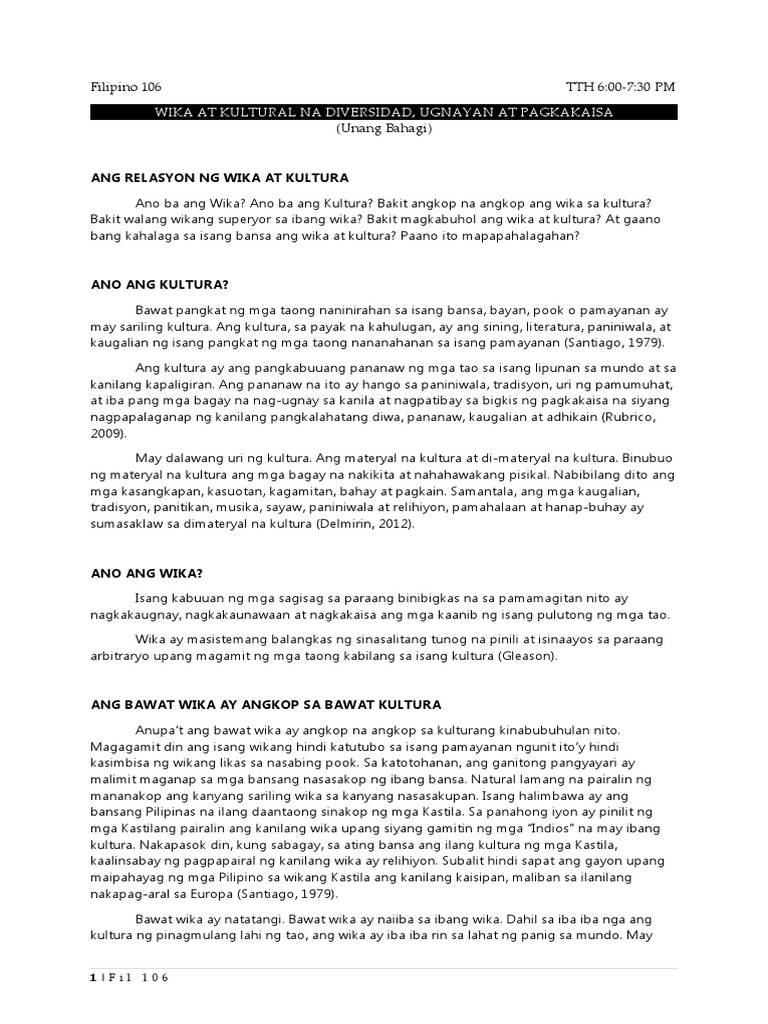 Wika At Kultural Na Diversidad Ugnayan At Pagkakaisa Pdf